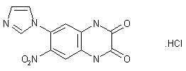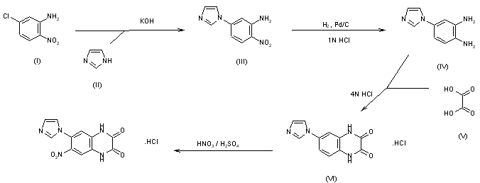 The condensation of 5-chloro-2-nitroaniline (I) with imidazole (II) by means of KOH in DMSO gives 5-(1-imidazolyl)-2-nitroaniline (III). Hydrogenation of (III) over Pd/C in 1N HCl gives the diamine (IV), which is condensed with oxalic acid (V) in 4N HCl yielding 6-(1-imidazolyl)quinoxaline-2,3(1H,4H)-dione hydrochloride (VI). Finally, this compound is nitrated with HNO3/H2SO4.