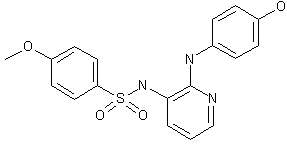 The condensation of 4-aminophenol (I) with 2-chloro-3-nitropyridine (II) in DMF at 100 C gives 4-(3-nitropyridin-2-ylamino)phenol (III), which is reduced with H2 over Pd/C in THF-methanol to afford 4-(3-aminopyridin-2-ylamino)phenol (IV). Finally, this compound is condensed with 4-methoxybenzenesulfonylchloride (V) by means of pyridine in THF.