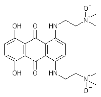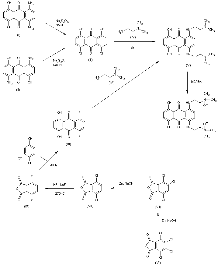 This compound has been obtained by two different methods: The reduction of 1,4-diamino-5,8-dihydroxyanthraquinone (I) or 1,5-diamino-4,8-dihydroxyanthraquinone (II) with Na2S2O4 and NaOH in water gives the leuco derivative (III), which is condensed with N,N-dimethylethylene-1,2-diamine (IV) in refluxing ethanol and reoxidized by air to yield 1,4-bis[2-(dimethylamino)ethylamino]-5,8-dihydroxyanthraquinone (V). Finally, this compound is treated with MCPBA in dichloromethane to afford the target bis-N-oxide. Alternatively, the reduction of tetrachlorophthalic anhydride (VI) with Zn and NaOH in water at 50-60 C gives 3,4,6-trichlorophthalic anhydride (VII), which is further reduced with Zn and NaOH in refluxing water to yield 3,6-dichlorophthalic anhydride (VIII). The reaction of (VIII) with KF and NaF at 260-27 ?C affords 3,6-difluorophthalic anhydride (IX), which is cyclized with hydroquinone (X) by means of AlCl3 and NaCl at 200 +/- 5 C to provide 1,4-difluoro-5,8-dihydroxyanthraquinone (XI). Finally, this compound is condensed with N,N-dimethylethylene-1,2-diamine (IV) in pyridine to afford the already reported 1,4-bis[2-(dimethylamino)ethylamino]-5,8-dihydroxyanthraquinone (V), which is oxidized with MCPBA as before.
