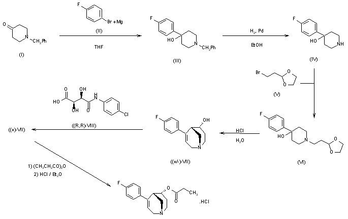 N-Benzyl-4-piperidone (I) was reacted with a Grignard reagent prepared from 4-fluorobromobenzene (II) to give the carbinol (III). The benzyl group was removed by catalytic hydrogenation and the resulting amine (IV) was alkylated with 3-bromopropionaldehyde ethylene acetal (V) to the alcohol (VI). Ring closure in hydrochloric acid gave the bicyclic endo-alcohol [(?-VII] along with some of the exo-isomer removed by crystallization. [(?-VII] was resolved by crystallization with (R,R)-tartaric acid mono-4-chloroanilide (VIII) to give [(+)-VII] of yet unknown absolute configuration. The latter was acylated with propionic anhydride followed by crystallization with hydrogen chloride in ether to furnish the end product.
