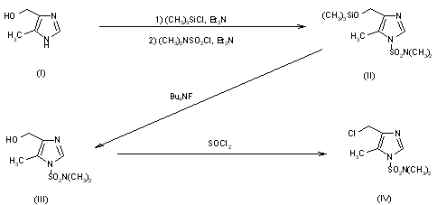 1) Treatment of 4-methyl-5-hydroxymethylimidazole (I) with trimethylsilyl chloride and triethylamine followed by reaction with N,N-dimethylsulfamoyl chloride gives the protected imidazole (II). Removal of the trimethylsilyl group by means of tetrabutylammonium fluoride affords the 5-hydroxymethylimidazole (III), which is converted into the chloromethylimidazole (IV) with thionyl chloride.