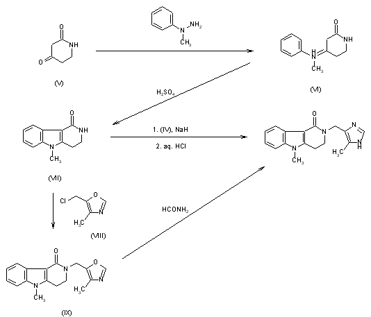 2) Alkylation of the tetrahydropyridoindolone (VII) with 5-chloromethyl-4-methyloxazole (VIII) in dimethoxyethane in the presence of sodium hydride affords (IX). Ammonolysis of this material is carried out by heating with formamide.