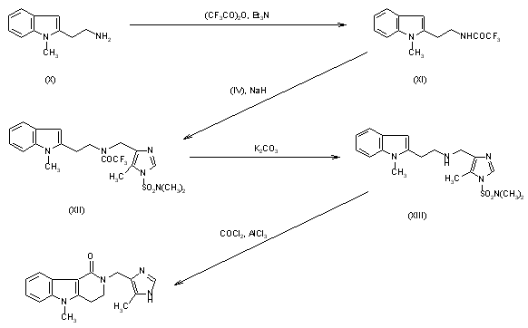 3) Treatment of 2-(1-methylindol-2-yl)ethanamine (X) in dichloromethane with trifluoroacetic anhydride and triethylamine yields the trifluoroacetamide (XI). This is alkylated with the chloromethylimidazole (IV) to give (XII) and then treated with aqueous potassium carbonate to generate the amino derivative (XIII). Finally, the reaction of (XIII) with phosgene and aluminum chloride in methylene chloride effects acylation and cyclization with concomitant removal of the protecting group.