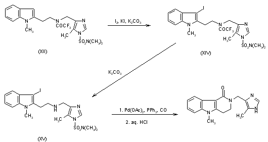 4) Treatment of the 2-substituted indole (XII) with iodine and potassium iodide in aqueous solution in the presence of potassium carbonate yields the corresponding 3-iodo derivative (XIV). Hydrolysis of the trifluoroacetyl group with aqueous potassium carbonate gives the amino derivative (XV), which undergoes a palladium-catalyzed carbonylation reaction to form the lactam. Finally, the protecting group is removed with hydrochloric acid.