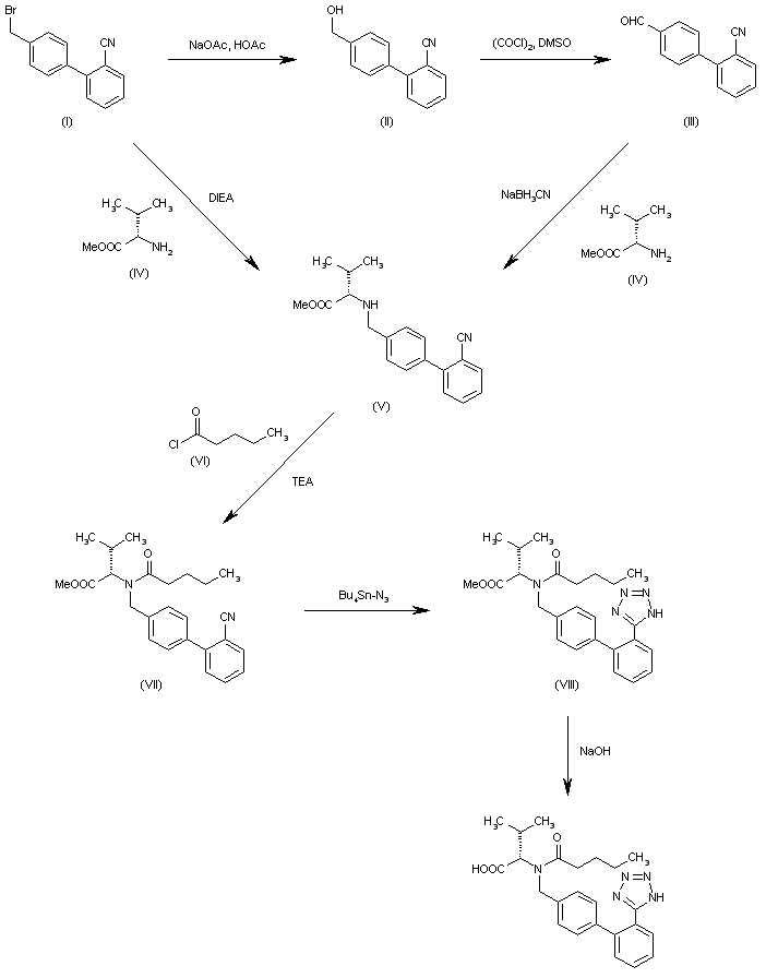This compound has been obtained by two related ways: 1) The hydrolysis of 4'-(bromomethyl)biphenyl-2-carbonitrile (I) with NaOAc in refluxing acetic acid gives the corresponding carbinol (II), which is oxidized with oxalyl chloride in DMSO/dichloromethane yielding the aldehyde (III). The reductocondensation of (III) with L-valine methyl ester (IV) by means of NaBH4CN in THF affords the N-alkylated valine (V), which is acylated with pentanoyl chloride (VI) and TEA in dichloromethane providing the pentanamide (VII). The reaction of the CN group of (VII) with tributyltin azide in refluxing xylene gives the tetrazol derivative (VIII). Finally, the ester group of (VIII) is hydrolyzed with NaOH to furnish the target compound. 2) L-valine methyl ester (IV) can be condensed directly with the bromo-methyl derivative (I) by means of DIEA in dichloromethane giving the N-alkylated valine (V) already reported.