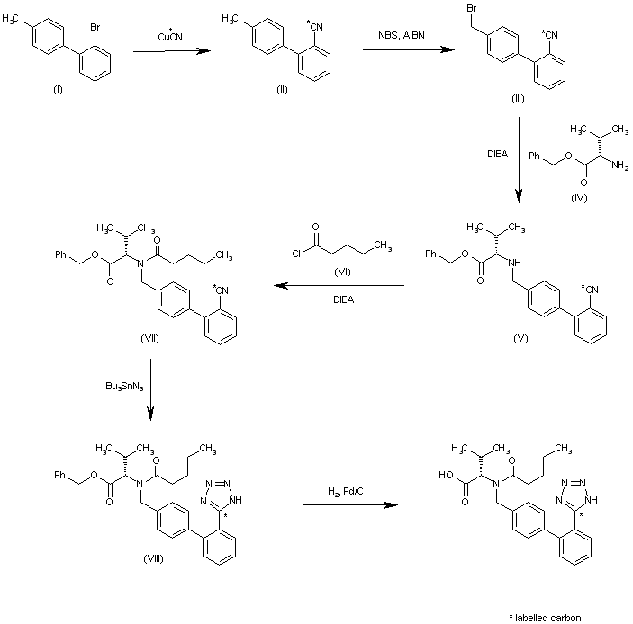 The reaction of 2-bromo-4'-methylbiphenyl (I) with 14C labeled cuprous cyanide in refluxing DMF gives 4'-methylbiphenyl-2-carbonitrile (II), which is brominated with NBS and AIBN in refluxing CCl4 to yield the bromomethyl derivative (III). The condensation of (III) with L-valine benzyl ester (IV) by means of DIEA in hot DMF affords the N-substituted valine (V), which is acylated with pentanoyl chloride (VI) and DIEA to provide the N-acylated valine (VII). The cyclization of the cyano group of (VII) with tributyltin azide at 140 C furnishes the tetrazol derivative (VIII) which is finally debenzylated by hydrogenation with H2 over Pd/C in dioxane.