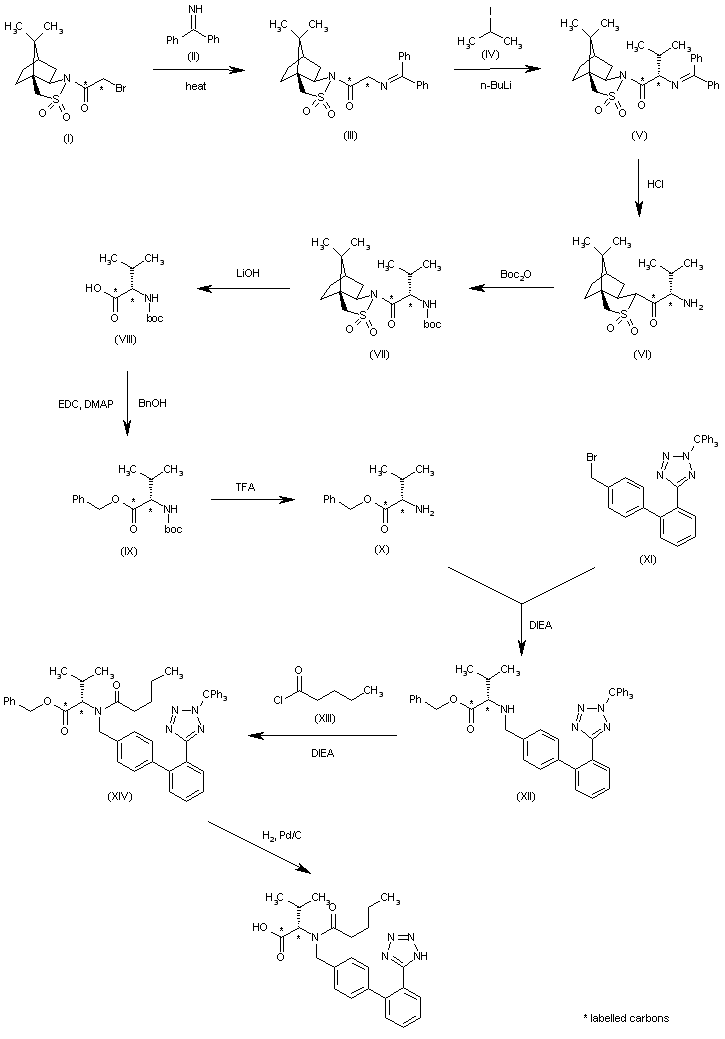 The reaction of 14C labeled chiral bromoacetyl sultam (I) with benzophenoneimine (II) in hot acetonitrile gives the substituted benzophenoneimine (III), which is estereoselectively alkylated with isopropyl iodide (IV) and n-BuLi in THF yielding the labeled L-valine derivative (V). The hydrolysis of (V) with HCl in THF affords the valine derivative (VI) with a free amino group that is protected with Boc2O in THF providing the carbamate (VII). The basic hydrolysis of (VII) with LiOH in THF gives the labeled N-(tert-butoxycarbonyl)-L-valine (VIII), which is esterified with Bn-OH, EDC and DMAP in dichloromethane yielding the protected benzyl ester (IX). Treatment of (IX) with TFA in dichloromethane affords L-valine benzyl ester (X), which is condensed with the bromomethylbiphenyl (XI) by means of DIEA in hot DMF to give the N-alkylated valine ester (XII). The acylation of (XII) with pentanoyl chloride (XIII) by means of DIEA in toluene yields the N-disubstituted valine ester (XIV), which is finally deprotected by hydrogenation with H2 over Pd/C in EtOH.