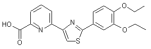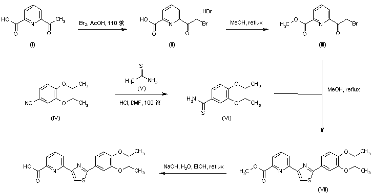 Bromination of 6-acetylpyridine-2-carboxylic acid (I) in hot AcOH generated the alpha-bromoketone (II), which was subsequently esterified to (III) upon refluxing in MeOH. Thioamide (VI) was prepared by treatment of 3,4-diethoxybenzonitrile (IV) with thioacetamide (V) in the presence of HCl. The thiazole derivative (VII) was then obtained by condensation of bromoketone (III) with thioamide (VI) in refluxing MeOH. Finally, basic hydrolysis of the methyl ester function of (VII) provided the title carboxylic acid