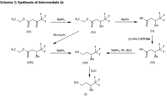 1) Synthesis of Butanol (I): 1a) The reduction of 4,4,4-trifluoro-2-oxobutyric acid ethyl ester (III) with NaBH4 in dichloromethane gives 4,4,4-trifluoro-2-hydroxybutyric acid ethyl ester (IV), which is hydrolyzed with NaOH in ethanol, yielding the corresponding acid (V). The optical resolution of (V) with 1(S)-phenylethylamine in hot ethanol affords the 3(R)-hydroxy enantiomer (VI) (1,3), which is reduced with NaBH4 and BF3 ethearate in THF to provide 4,4,4-trifluorobutane-1,3(R)-diol (VII). Finally, this compound is monotosylated by means of tosyl chloride and DMAP in pyridine to afford intermediate (I). 1b) The digestion of 4,4,4-trifluoro-3-hydroxybutyric acid ethyl ester (IV) with Novozym in a phosphate buffer gives the corresponding (R)-enantiomer (VIII), which is reduced with NaBH4 in ethanol, yielding 4,4,4-trifluorobutane-1,3(R)-diol (VII) (4). Finally, this compound is monotosylated by means of tosyl chloride as before to give butanol (I).