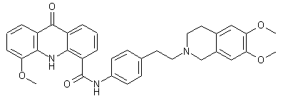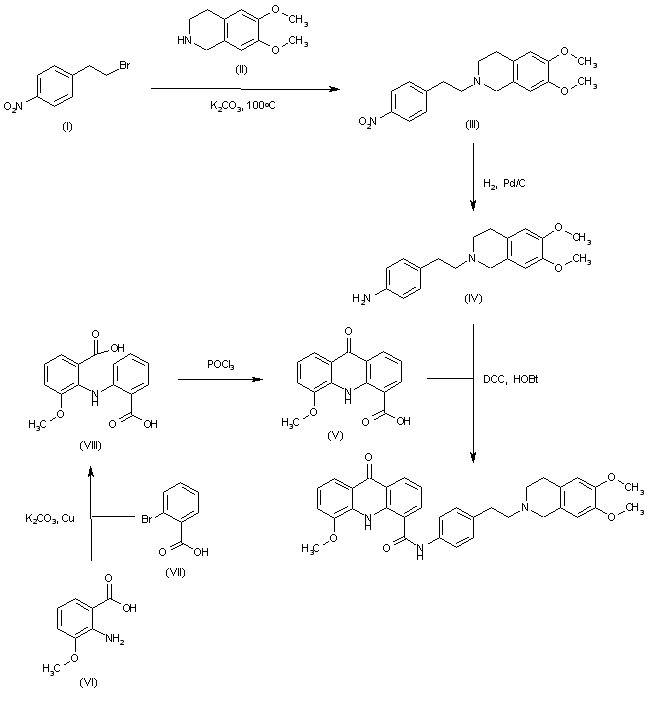 The condensation of 2-(4-nitrophenyl)ethyl bromide (I) with 6,7-dimethoxy-1,2,3,4-tetrahydroisoquinoline (II) by means of K2CO3 and KI in DMF at 100 C gives 6,7-dimethoxy-2-[2-(4-nitrophenyl)ethyl]-1,2,3,4-tetrahydroisoquinoline (III), which is reduced with H2 over Pd/C in ethanol to yield the corresponding amine (IV). Finally, this compound is condensed with 5-methoxy-9-oxo-9,10-dihydroacridine-4-carboxylic acid (V) by means of DCC and HOBt in DMF to afford the target carboxamide. The intermediate 5-methoxy-9-oxo-9,10-dihydroacridine-4-carboxylic acid (V) has been obtained as follows: The condensation of 2-amino-3-methoxybenzoic acid (VI) with 2-bromobenzoic acid (VII) by means of K2CO3 and copper dust give the diphenylamine (VIII), which is cyclized to the target acridine (V) by means of POCl3 in refluxing acetonitrile.