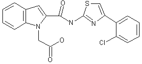 The esterification of indole-2-carboxylic acid (I) with benzyl alcohol and CDI gives the corresponding benzyl ester (II), which is alkylated with methyl bromoacetate (III) by means of NaH in DMF yielding 1-(methoxycarbonylmethyl)-1H-indole-2-carboxylic acid benzyl ester (IV). The debenzylation of (IV) with H2 over Pd/C in ethanol/DMF affords the free acid (V), which is condensed with 4-(2-chlorophenyl)thiazol-2-amine (VI) by means of benzotriazolyloxytris(dimethylamino)phosphonium hexafluorophosphate (BOP) in DMF to give the carboxamide (VII). Finally, the ester group of (VII) is hydrolyzed with NaOH or KOH in methanol/water.