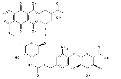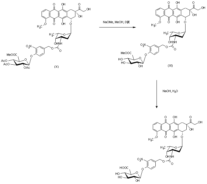 Ring opening of D-glucuronolactone (I) with NaOMe, followed by peracetylation and bromination of the resulting methyl uronate (II), afforded bromopyranose (III). Coupling of (III) with benzaldehyde (IV) using silver oxide in acetonitrile provided aldehyde (V), which was reduced with NaBH4 in the presence of silica gel in CHCl3-i-PrOH at 0 C to give benzyl alcohol (VI). Subsequent reaction with 4-nitrophenyl chloroformate (VII) in the presence of Et3N formed nitrophenyl carbonate (VIII) which, without purification, was coupled with doxorubicin (IX) in the presence of Et3N in DMF to give (X).