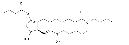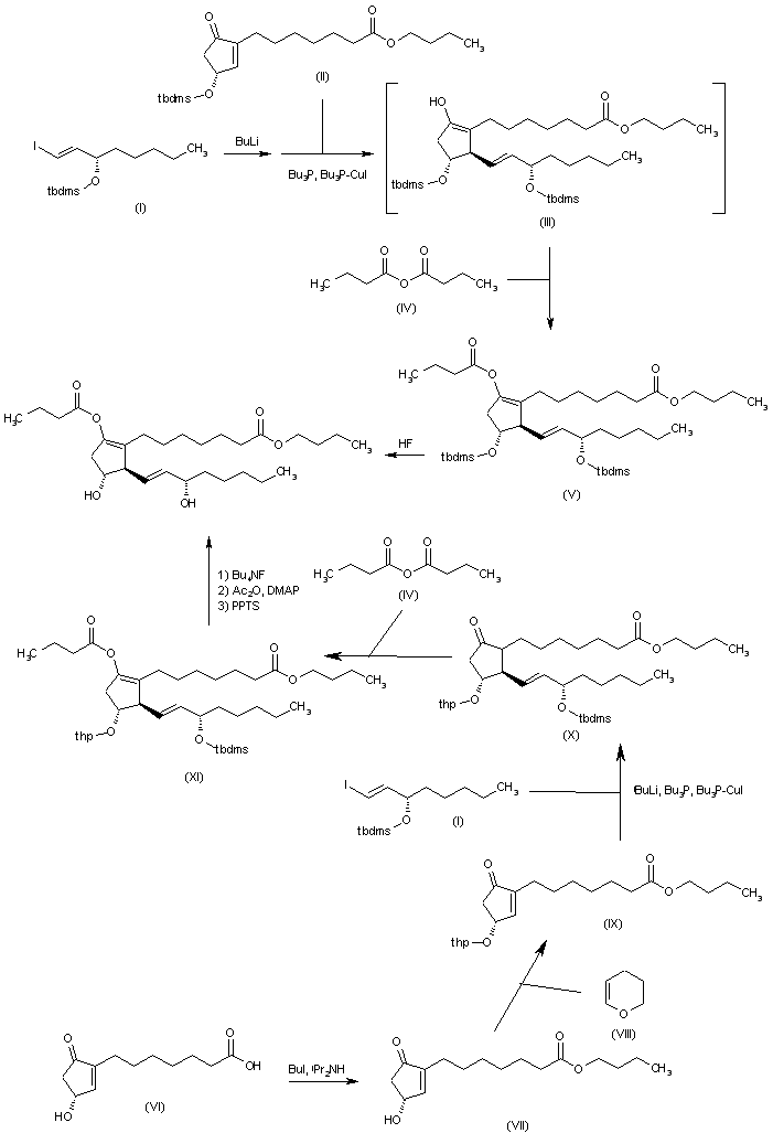 Treatment of (1E,3S)-1-iodo-3-(tert-butyldimethylsilyloxy)-1-octene (I) with BuLi in ethyl ether, followed by reaction with 7-[3(R)-(tert-butyldimethylsilyloxy)-5-oxo-1-cyclopenten-1-yl] heptanoic acid butyl ester (II) by means of tributylphosphine-copper(I) iodide complex and tributylphosphine in ethyl ether provides the protected nonisolated intermediate (III), which is treated with butyric anhydride (IV) to afford derivative (V). Finally, this compound is converted into the desired product by removal of the TBDMS groups by means HF in acetonitrile/H2O (1). Alternatively, the synthesis can be performed by following a different protection strategy: Esterification of carboxylic acid (VI) with butyl iodide in DMSO by means of diisopropylamine provides derivative (VII), which is then protected by reaction with 3,4-dihydro-2H-pyran (VIII) to furnish compound (IX). Next, coupling of (IX) with iodo derivative (I) by means of tert-BuLi, tributylphosphine - copper (I) iodide complex and tributylphosphine in ethyl ether gives the adduct (X), which by reaction with butyric anhydride (IV) affords derivative (XI). Finally, this compound is converted into the desired product by following this deprotection protocol: 1) Bu4NF in THF; 2) Ac2O, DMAP in CH2Cl2 in the presence of pyridine; and finally 3) pyridinium p-toluenesulfonate (PPTS) in EtOH.