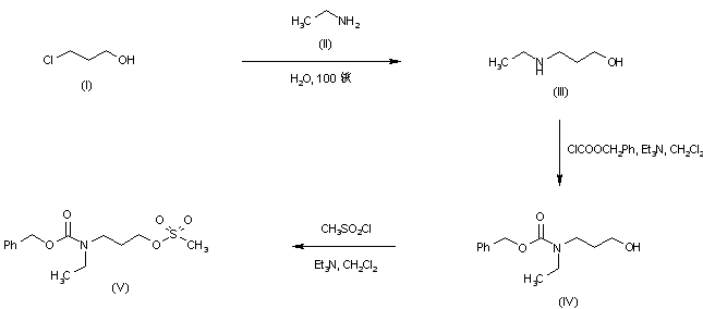 Alkylation of ethylamine (II) with 3-chloro-1-propanol (I) in a pressure vessel furnished 3-(ethylamino)-1-propanol (III). After protection of the secondary amine group of (III) upon treatment with benzyl chloroformate, the resultant N-(3-hydroxypropyl)carbamate (IV) was activated as the mesylate ester (V) with methanesulfonyl chloride and triethylamine.