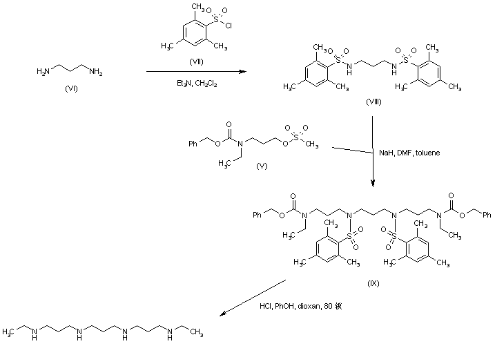 1,3-Diaminopropane (VI) was protected as the bis-sulfonamide (VIII) by acylation with mesitylenesulfonyl chloride (VII). The sodium salt of sulfonamide (VIII) was then alkylated with mesylate (V) in cold DMF/toluene to provide the fully protected tetraamine (IX). The sulfonyl and carbamate protecting groups of (IX) were finally removed by treatment with HCl in the presence of phenol at 80 C.