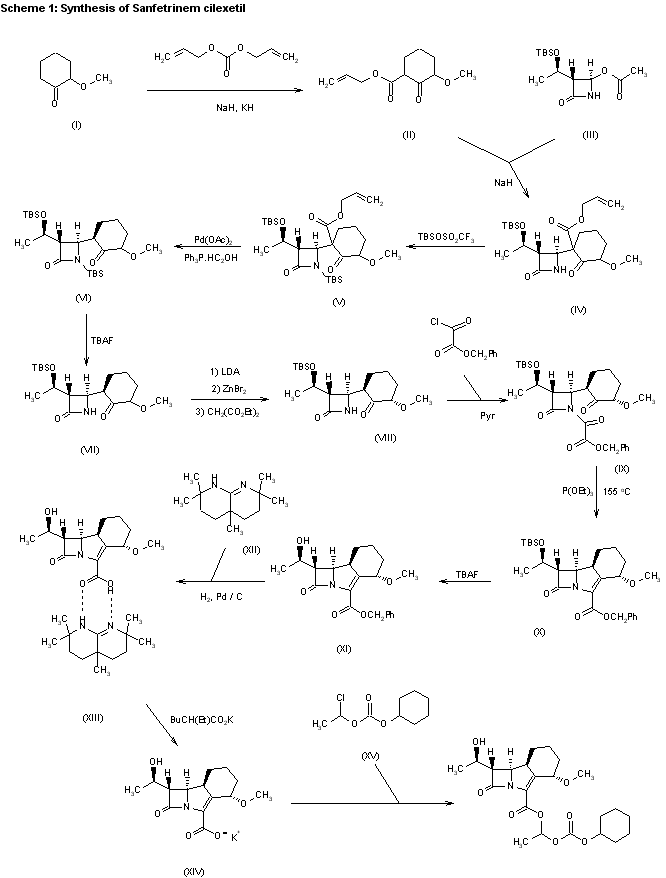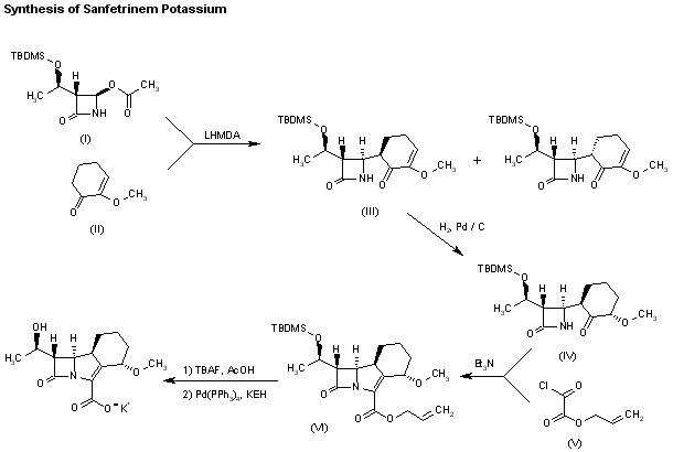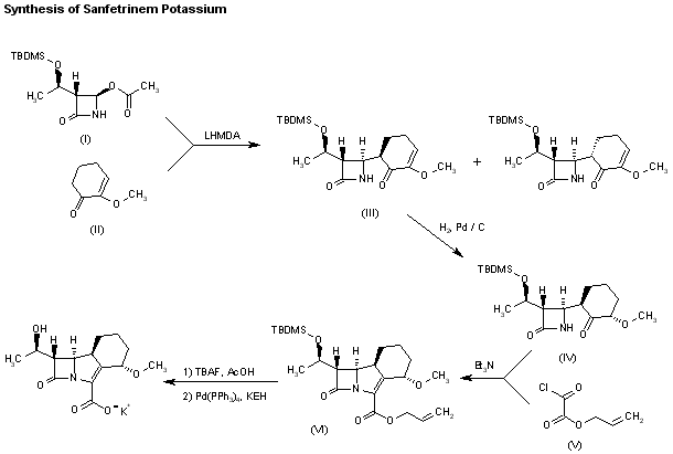 A new synthesis of sanfetrinem has been published: The condensation of (3S,4R)-4-acetoxy-3-[1(R)-(tert-butyldimethylsilyloxy)ethyl]azetidin-2-one (I) with 2-methoxy-2-cyclohexen-1-one (II) by means of lithium bis(trimethylsilyl)amide (LHMDA) in THF gives a mixture of diastereomers that are separated by flash chromatography yielding pure enantiomer (III). The hydrogenation of the double bond of (III) with H2 over Pd/C in ethyl acetate affords another mixture of diastereomers that are also separated by flash chromatography giving pure enantiomer (IV). The cyclization of (IV) with allyl acrylate (V) by means of triethylamine yields (4S,8S,9R,10S)-10-[1(R)-hydroxyethyl]-4-methoxy-11-oxo-1-azatricyclo[7.2.0.0(3,8)]undec-2-ene-2-carboxylic acid allyl ester (VI), the silylated allyl ester of sanfetrinem. Finally, this compound is desilylated by treatment with tetrabutylammonium fluoride (TBAF)/acetic acid in THF, and saponified with potassium 2-ethylhexanoate (KEH).