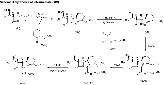 6) The condensation of 2-methyl-2-cyclohexen-1-one (XXIV) with the previously described azetidinone (III) by means of lithium diisopropylamide in THF, followed by flash chromatography, gives the enantiomerically pure 3-methoxy-3-cyclohexenylazetidinone (XXV), which by reduction with H2 over Pd/C in ethyl acetate followed by chromatography yields the previously described azetidinone (VIII). The cyclization of (VIII) with allyloxyoxalyl chloride (XXVI) by means of K2CO3 in dichloromethane affords (4S,8S,9R,10S)-1-[1(R)-(tert-butyldimethylsilyloxy)ethyl-4-methoxy-11-oxo-1-azatricyclo[7.2.0.0(3,8)]undec-2-ene-2-carboxylic acid allyl ester (XXVII), which is treated with tetrabutylammonium fluoride in THF/acetic acid to eliminate the TBS group giving the 1-hydroxyethyl derivative (XXVIII). Finally, this compound is treated with triphenylphosphine and potassium 2-ethylhexanoate to afford the potassium salt (XIV), already described in Scheme 18359601a.