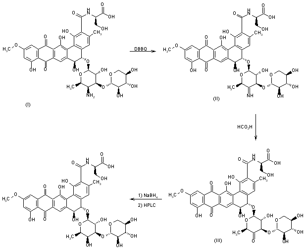 The oxidation of pradimicin FA-2 (I) with 3,5-di-tert-butyl-1,2-benzoquinone (DBBQ) according to Corey's method gives the corresponding imine (II), which by hydrolysis with formic acid is converted into the 4'-deamino-4'-oxo derivative (III). Finally, this compound is reduced with NaBH4 in water yielding the mixture of the 4'-hydroxy epimers, which is separated by HPLC chromatography.