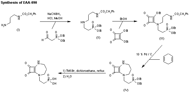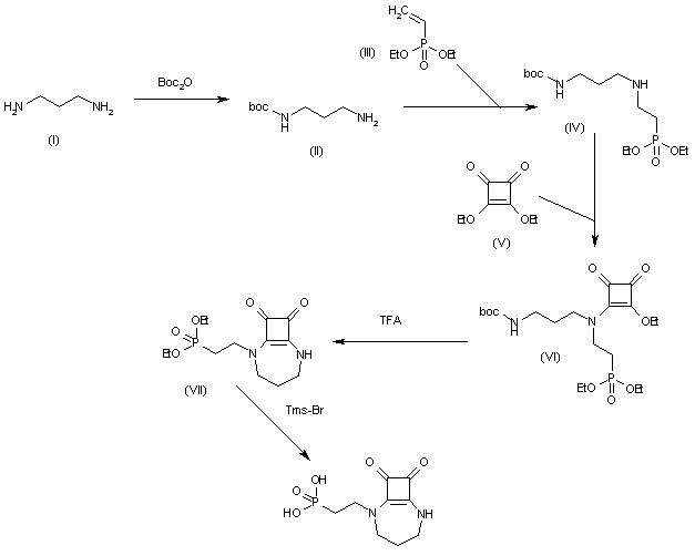 Combining (3-aminopropyl)carbamic acid benzyl ester (CBZ-protected propylene diamine) (I) with 2-oxoethylphosphonic acid diethyl ester under reductive amination conditions in the presence of sodium cyanoborohydride gives the CBZ-protected phosphonoethyl-substituted propylene diamine (II). The condensation of (II) with 3,4-diethoxy-3-cyclobutene-1,2-dione at room temperature in ethanol leads to the squaric acid analog (III). Removal of the CBZ protecting group under catalytic transfer hydrogenation conditions followed by spontaneous cyclization provides the penultimate diethylphosphonate ester (IV), which is hydrolyzed in the presence of bromotrimethylsilane in refluxing 1,2-dichloroethane to yield the final product in 15% overall yield.