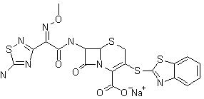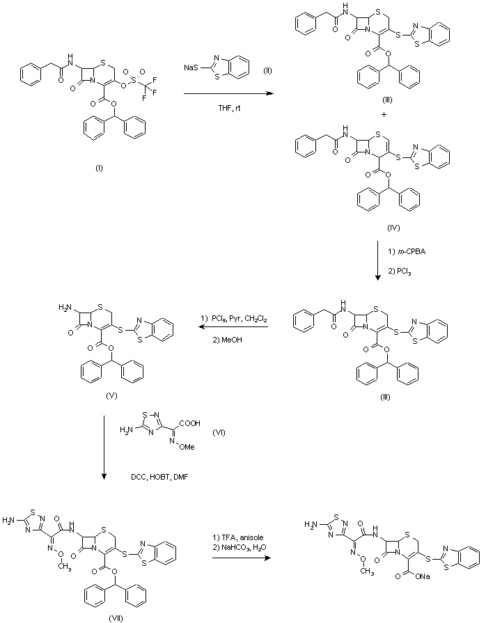 The substitution of the triflate group of (I) by the sodium thiolate (II) provided a mixture of 3-cephem (III) and 2-cephem (IV) compounds. Without purification, treatment of the mixture with m-chloroperbenzoic acid gave the corresponding S-oxides, which were reduced with PCl3 to yield the 3-cephem (III). The phenylacetyl group was removed by treatment with PCl5 and pyridine, followed by hydrolysis with MeOH to afford amine (V). Acylation with acid (VI) in the presence of dicyclohexyl carbodiimide (DCC) and 1-hydroxybenzotriazole (HOBT) yielded amide (VII). Then, removal of the benzhydryl protecting group using trifluoroacetic acid and anisole, followed by treatment with aqueous NaHCO3 provided the target cephalosporin.