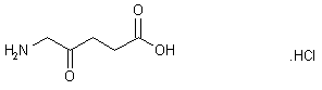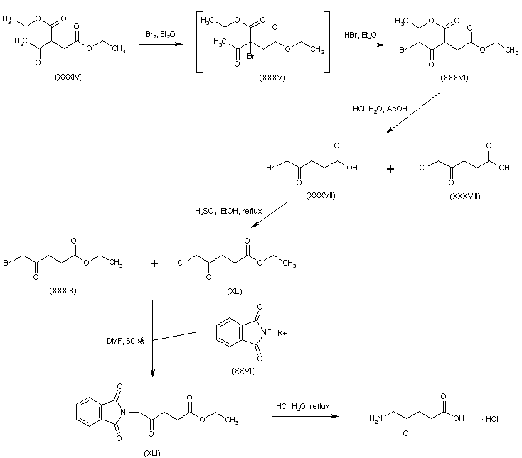 The bromination of ethyl acetylsuccinate (XXXIV) produced initially the beta-bromo derivative (XXXV), which upon standing for further 12 hours in the presence of the HBr generated in the reaction underwent rearrangement to the delta-bromo isomer (XXXVI). Hydrolysis and decarboxylation of (XXXVI) in the presence of HCl produced the expected delta-bromolevulinic acid (XXXVII) along with the chloro analogue (XXXVIII). Esterification of this mixture of acids with ethanol and sulfuric acid led to the respective ethyl esters (XXXIX) and (XL). Condensation of halo esters (XXXIX) and (XL) with potassium phthalimide (XXVII) furnished ethyl delta-phthalimidolevulinate (XLI), which was finally converted to the title compound by acidic hydrolysis.