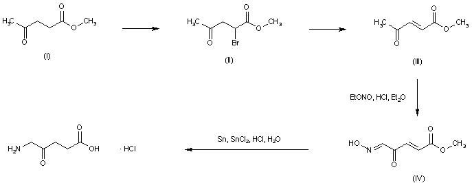 Methyl acetylacrylate (III) was obtained by bromination of methyl levulinate (I) followed by dehydrohalogenation of the resultant bromide (II). Isonitrosation of ketone (III) by means of ethyl nitrite in ethereal HCl produced the alpha-keto oxime (IV). Reduction of oxime (IV) and simultaneous ester hydrolysis by means of Sn/SnCl2 in concentrated HCl led to the target 5-aminolevulinic acid.
