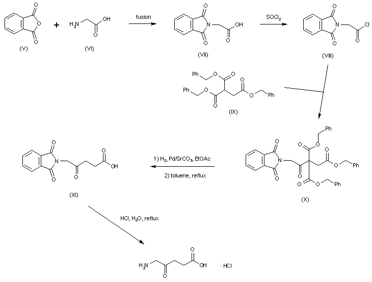 In a different method, N-phthaloylglycine (VII) was obtained by melting a mixture of phthalic anhydride (V) and glycine (VI). Subsequent chlorination of (VII) using SOCl2 provided acid chloride (VIII). Condensation of (VIII) with the sodium derivative of the tricarboxylate compound (IX) gave the keto triester (X). Hydrogenolysis of the benzyl ester groups of (X), followed by decarboxylation in refluxing toluene, gave rise to delta-phthalimidolevulinic acid (XI). This was finally hydrolyzed to the title compound upon refluxing with 7 N HCl.