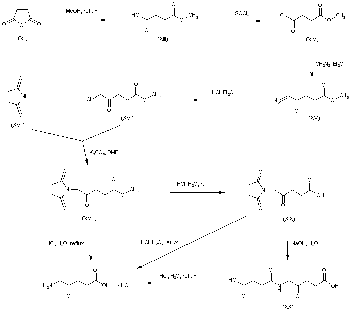 Alternatively, the mono-methyl ester of succinic acid (XIII) was prepared by refluxing succinic anhydride (XII) with MeOH. Subsequent treatment of (XIII) with SOCl2 gave acid chloride (XIV). This was condensed with diazomethane to produce the diazo ketone (XV), which was further converted to the chloro ketone (XVI) by treatment with HCl. Condensation of chlorolevulinate (XVI) with succinimide (XVII) produced methyl delta-succinimidolevulinate (XVIII). Smooth acidic hydrolysis of the methyl ester group of (XVIII) led to the succinimido acid (XIX), which was further hydrolyzed to the succinamido acid (XX) under basic conditions. The title compound could be obtained by hydrolysis of either (XVIII), (XIX) or (XX) in refluxing 7N HCl.