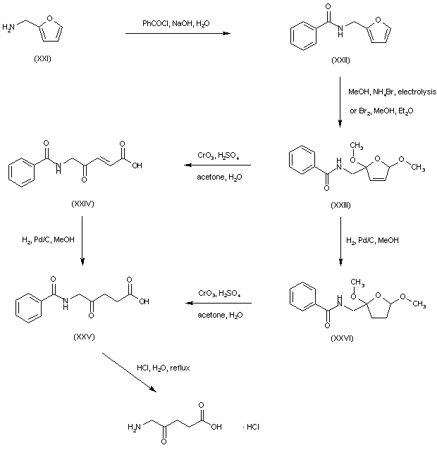 Benzoylation of furfurylamine (XXI) under Schotten-Baumann conditions provided amide (XXII). The dimethoxy dihydrofuran derivative (XXIII) was then obtained as different diastereomeric mixtures by either the electrolysis of N-benzoylfurfurylamine (XXII) in the presence of NH4Cl in MeOH or by the bromination of (XXII) in MeOH. Oxidative cleavage of (XXIII) using the Jones reagent led to 5-benzamido-4-oxo-2-pentenoic acid (XXIV), which was further hydrogenated to the pentanoic analogue (XXV). Alternatively, (XXV) was also obtained by first hydrogenation of (XXIII) to the tetrahydrofuran (XXVI), which was then subjected to Jones oxidation. Finally, acidic hydrolysis of delta-benzamido levulinic acid (XXV) provided the title compound.