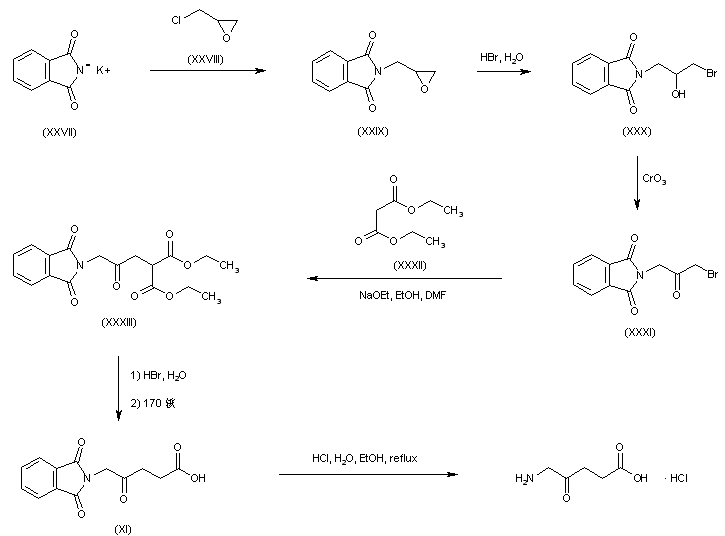 Alkylation of potassium phthalimide (XXVII) with epichlorohydrin (XXVIII) provided N-glycidyl phthalimide (XXIX). Epoxide ring opening in (XXIX) with aqueous HBr led to bromohydrin (XXX), which was further oxidized to bromo ketone (XXXI) by means of CrO3. Coupling of bromo ketone (XXXI) with diethyl malonate (XXXII) to afford (XXXIII) was accomplished in the presence of NaOEt in EtOH/DMF as the solvent. Acid hydrolysis of the malonate ester (XXXIII), followed by thermal decarboxylation, gave rise to phthalimido levulinic acid (XI). The phthaloyl group of (XI) was finally hydrolyzed under acidic conditions to furnish delta-aminolevulinic acid.
