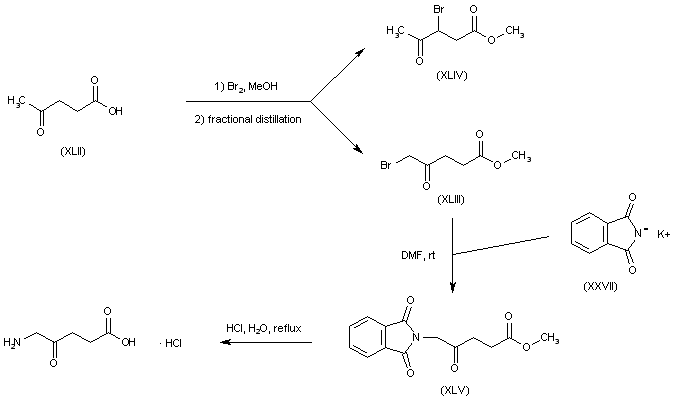 In a related strategy, the bromination of levulinic acid (XLII) in MeOH yielded the 3-bromo (XLIV) and 5-bromo (XLIII) esters, which could be separated by distillation. Condensation of methyl 5-bromolevulinate (XLIII) with potassium phthalimide (XXVII) provided methyl phthalimido levulinate (XLV), which was finally hydrolyzed under the same conditions as above for analogous the ethyl ester.