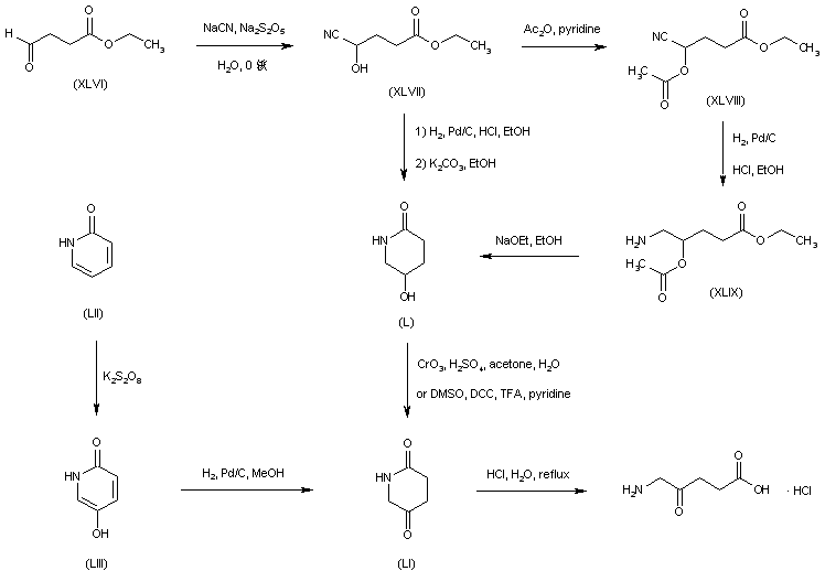 Ethyl 4-oxobutyrate (XLVI) was converted to the sulfite addition compound, which was then displaced by NaCN to afford cyanohydrin (XLVII). Acetylation of cyanohydrin (XLVII) provided the acetoxy nitrile (XLVIII), which was further hydrogenated to the amino diester (XLIX). Intramolecular cyclization of (XLIX) in ethanolic NaOEt led to the hydroxy lactam (L). Optionally, (L) could be obtained by hydrogenation of hydroxy nitrile (XLVII), followed by lactamization in the presence of K2CO3. Subsequent oxidation of hydroxypiperidinone (L) to 2,5-piperidinedione (LI) was carried either using the Jones reagent or under Swern conditions. Finally, acid hydrolysis of keto lactam (LI) gave rise to the title aminolevulinic acid. The preparation of 2,5-piperidinedione (LI) was also reported by a different method. Thus, catalytic hydrogenation of 5-hydroxy-2-pyridone (LIV), which had been obtained by Elbs oxidation of pyridone (LIII), furnished piperidinedione (LI).