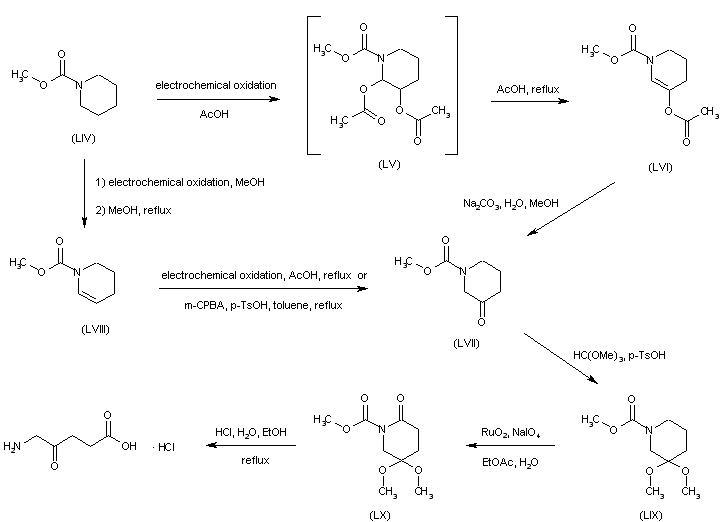 In a different preparation of the protected piperidinedione (LX), electrochemical oxidation of N-(methoxycarbonyl)piperidine (LIV) in HOAc produced the diacetoxy intermediate (LV) which on further refluxing in HOAc generated the acetoxy tetrahydropyridine (LVI). Smooth hydrolysis of the enol ester (LVI) provided the 3-piperidinone (LVII). In a related method, piperidine (LIV) was subjected to electrochemical oxidation in MeOH leading to tetrahydropyridine (LVIII), which was further converted to piperidinone (LVII) by either chemical or electrochemical oxidation. Ketone (LVII) was protected as the dimethyl ketal, (LIX) and its piperidine ring was then oxidized to lactam (LX) by means of RuO2 in the presence of NaIO4. The protected piperidinedione (LX) was finally hydrolyzed to the title compound in refluxing 7 M HCl.