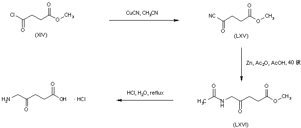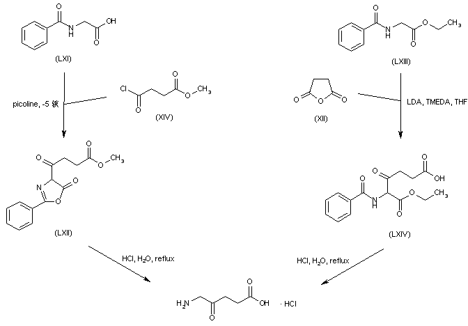 The acylation of hippuric acid (LXI) with methyl succinyl chloride (XIV) in cold 4-picoline gave rise to the acyl oxazolinone (LXII). Subsequent acidic hydrolysis of (LXII) provided delta-aminolevulinic acid. In a related strategy, the lithio-dianion of ethyl hippurate (LXIII) was acylated with succinic anhydride (XII) producing the 2-amino-3-oxoadipic acid derivative (LXIV). Further hydrolysis and decarboxylation of (LXIV) under acidic conditions furnished the target compound.