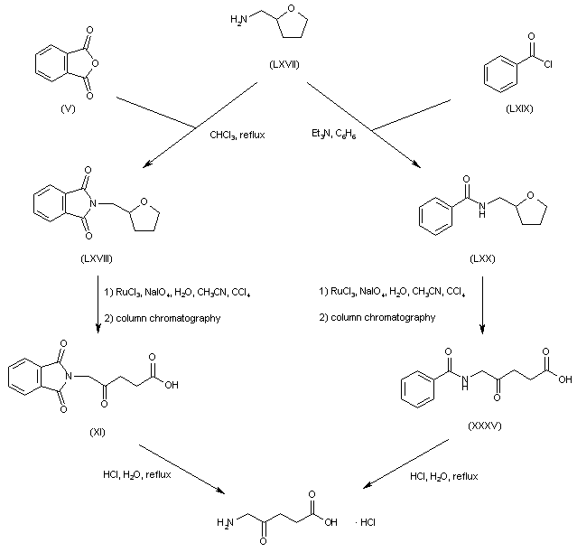 Tetrahydrofurfurylamine (XLVII) was converted into the corresponding phthalimide (XLVIII) by reaction of phthalic anhydride (V) in boiling chloroform. Subsequent ruthenium-catalyzed oxidation of (XLVIII) produced keto acid (XI), along with a pentanolide by-product, which was removed by column chromatography. Finally, acid hydrolysis of (XI) led to the desired compound. A closely related strategy was based in the ruthenium oxidation of N-benzoyl tetrahydrofurfurylamine (LXX), prepared from amine (XLVII) and benzoyl chloride (XLIX), to afford 5-benzoylaminolevulinic acid (XXXV), which was then hydrolyzed in boiling 6 N HCl .