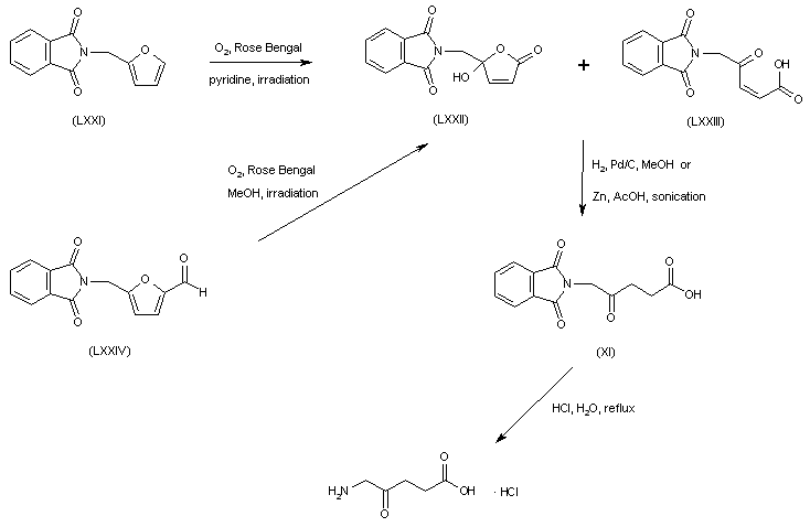 A related method was based on the oxidation of N-furfuryl phthalimide (LXXI) under irradiation by light in the presence of oxigen gas and a sensitizer, such as Rose Bengal, to afford the 2,5-dihydrofuranone (LXXII) along with its ring-opened isomer (LXXIII). Subsequent catalytic hydrogenation provided phthalimidolevulinic acid (XI), which was then subjected to acidic hydrolysis. Butenolide (LXXII) was also obtained by the photooxygenation of 5-phthalimidomethyl)furfural (LXXIV). Reduction of (LXXII) to phthalimidolevulinic acid (XI) was accomplished using zinc dust in HOAc under sonication.