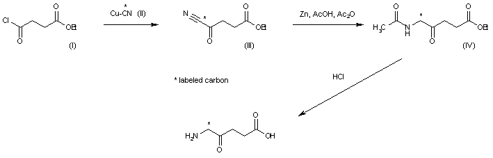 The condensation of 3-(chloroformyl)propionic acid ethyl ester (I) with labeled CuCN (II) in refluxing acetonitrile gives 3-(cyanoformyl)propionic acid ethyl ester (III), which is reduced with Zn, AcOH and Ac2O to yield labeled 5-(acetamido)-4-oxopentanoic acid ethyl ester (IV). Finally, this compound is hyrolyzed by means of refluxing 6M HCl to afford the target labeled aminolevulinic acid.