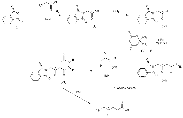 The condensation of phthalic anhydride (I) with 1-13C-labeled glycine (II) by heating at 160 C gives 2-phthalimidoacetic acid (III), which is treated with refluxing SOCl2 to yield the acetyl chloride (IV). The condensation of (IV) with Meldrum's acid (V) by means of pyridine in dichloromethane, followed by a treatment with refluxing ethanol affords 4-phthalimidoaetoacetic acid ethyl ester (VI). This compound is condensed with 2-bromoacetic acid ethyl ester (VII) by means of NaH in dimethoxyethane to provide labeled 2-(2-phthalimidoacetyl)succinic acid diethyl ester (VIII). Finally, the compound is treated with HCl in refluxing acetic acid to give the target labeled aminolevulinic acid.