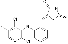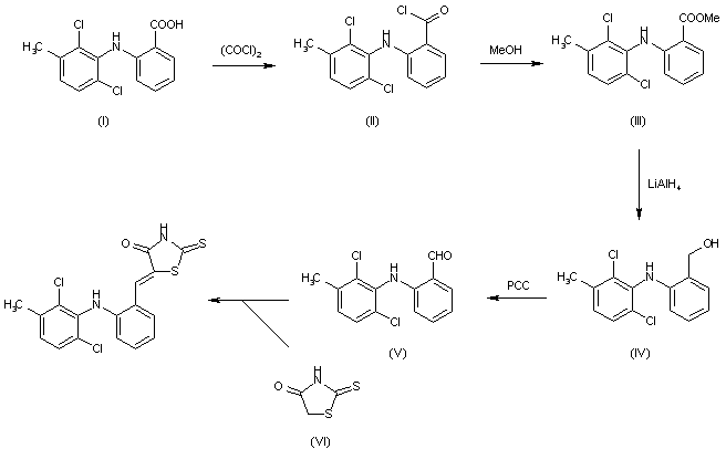 The reaction of meclofenamic acid (I) with oxalyl chloride in dichloromethane gives the corresponding acyl chloride (II), which by reaction with methanol yields the methyl ester (III). The reduction of (III) with LiAlH4 in THF affords the methanol derivative (IV), which by oxidation with pyridinium chlorochromate (PCC) is converted into the aldehyde (V). Finally, this compound is condensed with 2-thioxothiazolidin-4-one (VI) by means of beta-alanine in refluxing acetic acid.