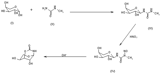 The synthesis of aranoza (IV) was accomplished by the condensation of N-methylurea (II) with L-arabinose (I), which yields 3-a-L-arabinopyranosyl-1-methylurea (III), followed by nitrosation of the latter. In slightly alkaline conditions or upon heating, aranoza undergoes intramolecular carbamoylation to produce N1O3-carbonyl-a-L-arabinopyranosylamine (V), gaseous N2 and methanol. It is important that diazomethane (CH2N2) is not formed under these conditions as demonstrated by gas chromatography and mass spectrometry.