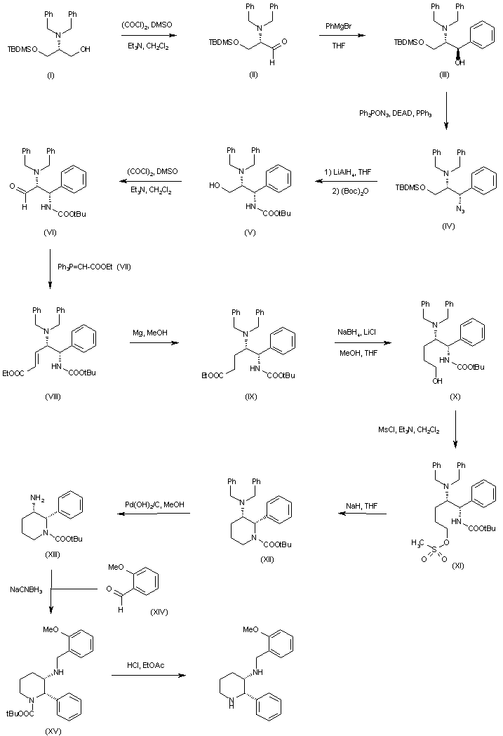 Swern oxidation of N,N-dibenzyl-O-(tert-butyldimethylsilyl)serinol (I) afforded the intermediate aldehyde (II), which was condensed with phenylmagnesium bromide to give carbinol (III) as the major diastereoisomer. Displacement of the hydroxyl group of (III) with diphenylphosphoryl azide in the presence of diethyl azodicarboxylate and triphenylphosphine provided azide (IV). This was reduced to the corresponding amine with concomitant desilylation using LiAlH4. Further in situ addition of (Boc)2O produced carbamate (V). The alcohol function of (V) was then oxidized under Swern conditions, and the resulting aldehyde (VI) was condensed with phosphonate (VII) to yield unsaturated ester (VIII). Reduction of (VIII) to the saturated ester (IX) with Mg in MeOH, and further reduction of the ester group employing lithium borohydride gave rise to alcohol (X). After conversion of (X) to mesylate (XI), cyclization in the presence of NaH in THF furnished piperidine (XII). Debenzylation of (XII) afforded primary amine (XIII), which was reductively alkylated with 2-methoxybenzaldehyde (XIV) in the presence of NaCNBH3 to provide (XV). Finally, acid deprotection of the Boc group of (XV) yielded the title compound.