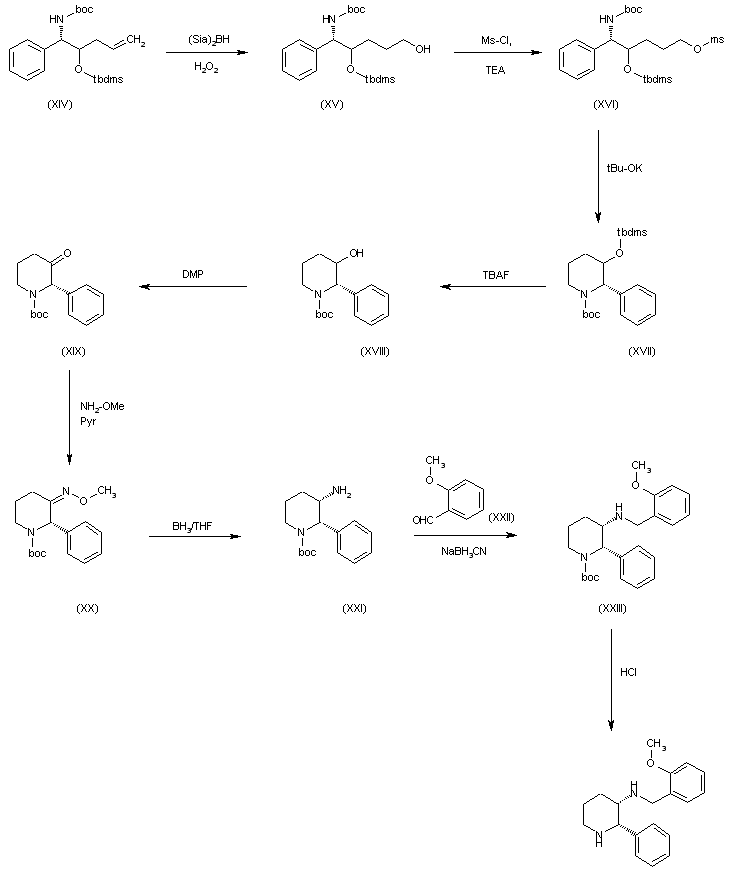 ). The hydroxylation of the double bond of (XIV) by means of (Sia)2BH and H2O2 affords the pentanol (XV), which is treated with MsCl and TEA to provide the mesylate (XVI). The cyclization of (XVI) by means of t-BuOK in THF gives the piperidine (XVII), which is desilylated by means of TBAF to yield the piperidinol (XVIII). The oxidation of (XVIII) by means of DMP affords the piperidinone (XIX), which is treated with O-methylhydroxylamine and pyridine to provide the O-methyloxime (XX). The reduction of (XX) with BH3/THF gives the cis-disubstituted piperidine (XXI), which is submitted to a reductocondensation with 2-methoxybenzaldehyde (XXII) by means of NaBH3CN in methanol to yield the secondary amine (XXIII). Finally, the carbamate group of (XXIII) is cleaved by means of HCl in methanol to provide the target piperidine derivative