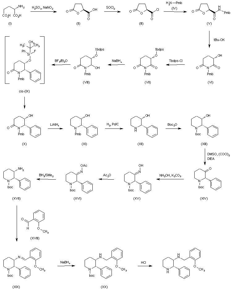 The cyclization of (S)-glutamic acid (I) by means of H2SO4 and NaNO2 gives the gamma lactone (II), which is treated with hot SOCl2 to yield the corresponding acyl chloride (III). The reaction of (III) with 4-methoxybenzylamine (IV) affords the expected amide (V), which is submitted to rearrangement in the presence of t-BuOK in THF to provide piperidinedione (VI). The reaction of (VI) with Tbdps-Cl and imidazole gives the silyl ether (VII), which is reduced with NaBH4 in methanol to yield a mixture of regioisomers (VIII). The phenyl migration in (VIII) was easily promoted by reaction with BF3/Et2O through the nonisolated intermediate cis-(IX) to yield (X). The reduction of (X) by means of LiAlH4 in THF affords the N-protected hydroxypiperidine (XI), which is deprotected by hydrogenation with H2 over Pd/C in ethanol to provide the free hydroxypiperidine (XII). The reprotection of (XII) with Boc2O gives the carbamate-protected piperidine (XIII), which is oxidized by means of DMSO, (COCl)2 and DIEA in dichloromethane to yield piperidone (XIV). The reaction of (XIV) with NH2OH and K2CO3 affords the corresponding oxime (XV), which is treated with Ac2O in THF to provide the O-acetyloxime (XVI). The reduction of (XVI) with BH3/Me2S in hot THF gives the expected amine (XVII), which is condensed with 2-methoxybenzaldehyde (XVIII) in THF to yield the imine (XIX). The reduction of (XIX) with NaBH4 in methanol affords the protected benzylamine (XX), which is finally deprotected by means of HCl in methanol to provide CP-99,994.