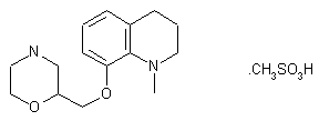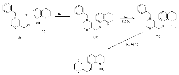 The condensation of 4-benzyl-2-(chloromethyl)morpholine (I) with 8-hydroxy-1,2,3,4-tetrahydroquinoline (II) by means of NaH in hot DMF gives 8-(4-benzylmorpholin-2-ylmethoxy)-1,2,3,4-tetrahydroquinoline (III), which is methylated with methyl iodide and K2CO3 in refluxing acetone yielding the corresponding N-methyl derivative (IV). Finally, this compound is debenzylated by hydrogenolysis with H2 over Pd/C in ethanol.