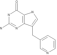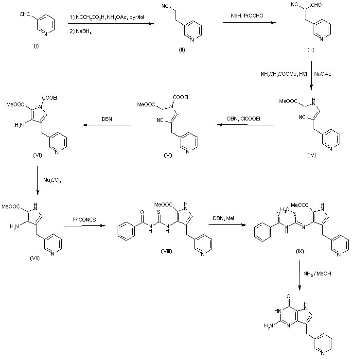 BCX-34 is synthesized from 3-pyridylcarboxaldehyde in ten steps in 10% overall yield as described by Montgomery et al. and depicted in Scheme 19337601a. The reaction of (I) with cyanoacetic acid followed by sodium borohydride reduction of the substituted acrylonitrile intermediate gave (II) in good yield. A key step in the synthesis is the formation of aldehyde (III) using sodium hydride and ethyl formate. The enamine (IV) is then prepared from (III) and glycine methyl ester hydrochloride buffered with sodium acetate. Protection of the enamine nitrogen of (IV) is required to yield (V) before cyclization to pyrrole (VI) is carried out using 1,5-diazabicyclo[4.3.0]non-5-ene (DBN). This reaction gives a mixture of (VI) and (VII) as products and the mixture is all converted to (VII) by sodium carbonate hydrolysis before isolation of solid (VII). The cyclization of the pyrimidine ring portion of BCX-34 is accomplished in three steps from (VII) through a sequence first described by Yamazaki et al. A study of the reaction conditions for the final cyclization step of the synthesis of Peldesine described in scheme 19337601a, in order to improve the yield of the target compound, and to minimize the side products, is presented in Org Proc Res Develop 2000, 4: 129.