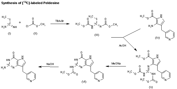 An improved synthesis of [14C]-peldesine has been reported: The reaction of S-methyl-[14C]-isothiourea (I) with methyl chloroformate (II) by means of tetrabutylammonium bromide in dichloromethane gives N,N'-bis(methoxycarbonyl)-S-methyl-[14C]-isothiourea (III). This compound is condensed with 3-amino-4-(3-pyridylmethyl)-1H-pyrrole-2-carboxylic acid methyl ester (IV) by means of acetic acid in methanol yielding the labeled guanidine (V). The cyclization of (V) by means of sodium methoxide in methanol affords the carbamate precursor (VI), which is finally deprotected with NaOH in hot water.