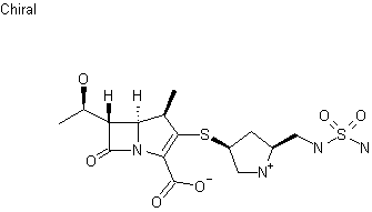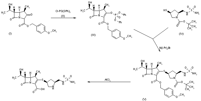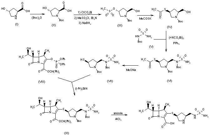 A new synthesis of S-4661 has been reported: The protection of trans-4-hydroxy-L-proline with tert-butoxycarbonyl anhydride gives N-(tert-butoxycarbonyl)-4(R)-hydroxy-L-proline (II), which is successively treated with ethyl chloroformate, mesylated with mesyl chloride and reduced with NaBH4 yielding (2S,4R)-1-(tert-butoxycarbonyl)-2-(hydroxymethyl)-4-(methanesulfonyloxy)pyrrolidine (III). The reaction of (III) with potassium thioacetate affords Compound (IV), which is condensed with N-(tert-butoxycarbonyl)sulfamide (V) by means of diethyl azodicarboxylate and triphenylphosphine to give the protected pyrrolidinesulfamide (VI). The deacetylation of (VI) with sodium methoxide yields (2S,4S)-1-(tert-butoxycarbonyl)-2-[N-(tert-butoxycarbonyl)-N-sulfamoylaminomethyl]-4-sulfanylpyrrolidine (VII), which is then condensed with (1R,5S,6S)-2-(diphenoxyphosphoryloxy)-6-[1(R)-hydroxyethyl]-1-methyl-1-carba-2-penem-3-carboxylic acid diphenylmethyl ester (VIII) by means of diisopropylethylamine to afford the protected final product (IX). Finally, this compound is deprotected with AlCl3 in anisole.