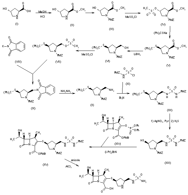 A new synthesis of S-4661 has been reported: The esterification of trans-4-hydroxy-L-proline (I) with methanol/HCl gives the corresponding methyl ester (II), which is N-protected as trans-N-(4-methoxybenzyloxycarbonyl)-4-hydroxy-L-proline methyl ester (III). The mesylation of (III) with methanesulfonyl chloride and triethylamine in dichloromethane affords the 4-O-mesylate (IV), which is treated with sodium triphenylmethylsulfide giving cis-N-(4-methoxybenzyloxycarbonyl)-4-(triphenylmethylsulfanyl)-L-prolin e methyl ester (V). The reduction of (V) with LiBH4 in THF yields the corresponding methanol (VI), which is mesylated as before affording (VII). The reaction of (VII) with potassium phthalimide (VIII) gives the adduct (IX), which is cleaved with hydrazine yielding (2S,4S)-2-(aminomethyl)-1-(4-methoxybenzyloxycarbonyl)-4-(triphenylmeth ylsulfanyl)pyrrolidine (X). The condensation of (X) with N-(4-methoxybenzyl)sulfamoyl chloride (XI) by means of triethylamine affords the corresponding protected sulfamide (XII). Deprotection of the trityl group of (XII) by treatment with silver nitrate and pyridine affords compound (XIII) with a free SH group. The reaction of (XIII) with (1R,5S,6S)-2-(diphenoxyphosphoryloxy)-6-[1(R)-hydroxyethyl]-1-methyl-1-carba-2-penem-3-carboxylic acid 4-methoxybenzyl ester (XIV) by means of diisopropylethylamine yields the protected final product (XV), which is finally treated with AlCl3 in anisole to eliminate the protecting groups.
