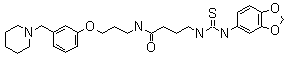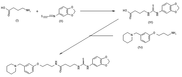 The condensation of gamma-aminobutylic acid (I) with 3,4-methylenedioxyphenylisothiocyanate (II) in ethanol-H2O gives 1-[3-(carboxy)propyl]-3-(3,4-methylenedioxyphenyl)thiourea (III), which is allowed to react with 3-[3-(piperidinomethyl)phenoxy]propylamine (IV) by means of ethyl chloroformate and triethylamine in dichloromethane to afford TRM-115.