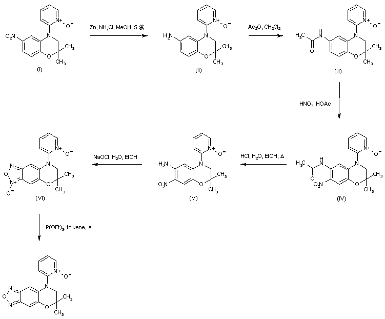 Reduction of nitrobenzoxazine (I) using Zn and NH4Cl afforded the corresponding amine (II), which was acetylated with acetic anhydride to give amide (III). Subsequent nitration of (III) yielded the 6-acetamido-7-nitro derivative (IV). Acidic hydrolysis of amide function of (IV) then furnished the nitroaniline (V). Further oxidative ring closure using sodium hypochlorite produced the benzofuroxan (VI). Finally, the N-oxide group was selectively reduced by treatment with triethyl phosphite to give the target compound.